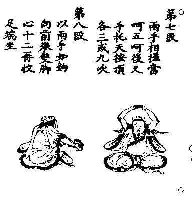 以两手向前攀脚心十二次乃收足端坐